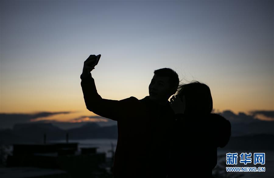 12月28日,在峨眉山金頂,一對(duì)情侶在落日余暉中拍照。時(shí)值冬日,峨眉山銀裝素裹、宛如仙境。新華社記者李夢馨攝