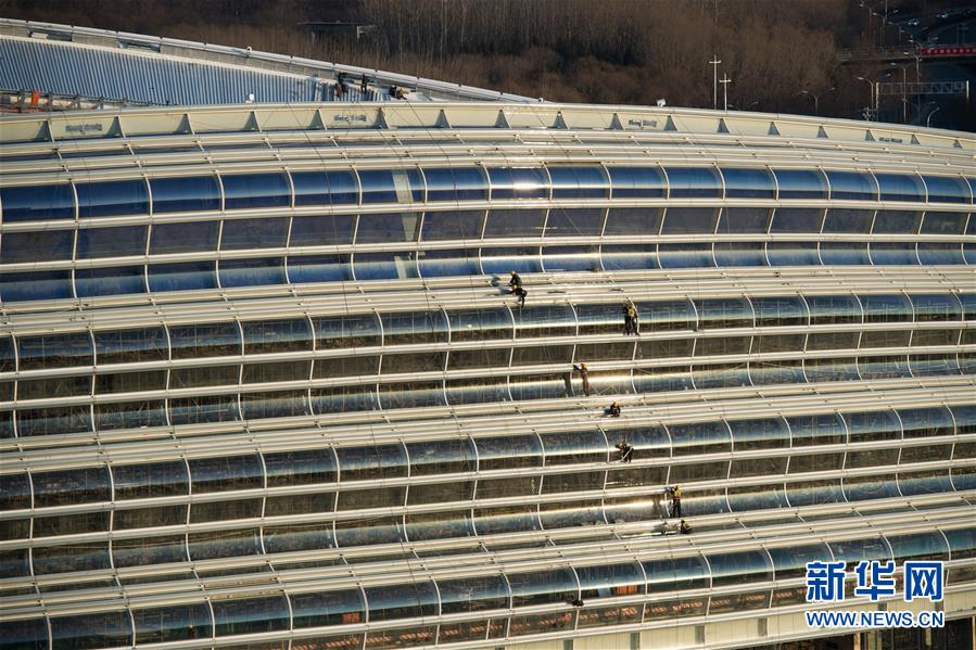 12月31日,施工人員在國(guó)家速滑館施工現(xiàn)場(chǎng)安裝最后一塊屋面單元板塊。新華社記者鞠煥宗攝