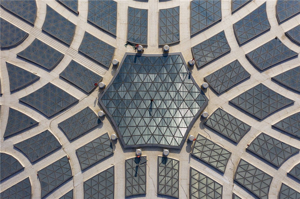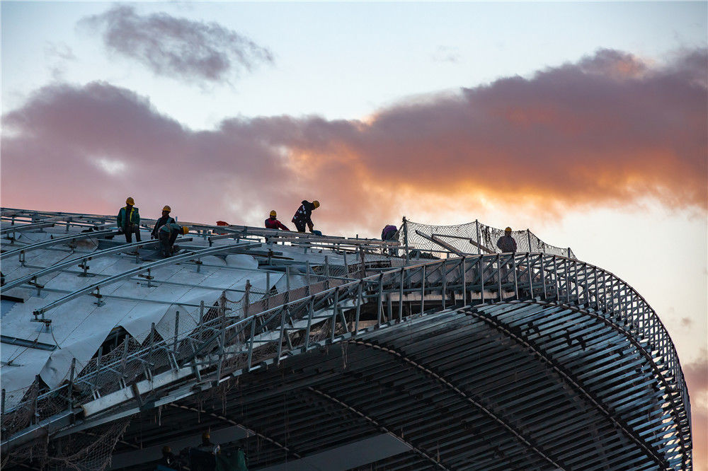 2019年1月13日,北京大興機(jī)場航站樓頂部最中央,一個(gè)工人正在進(jìn)行驗(yàn)收工作。陳國亨/視覺中國