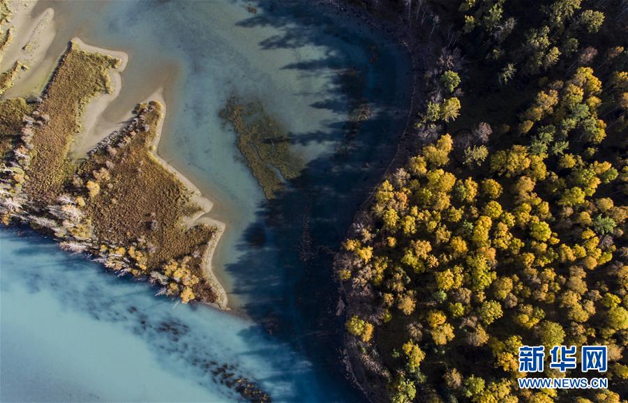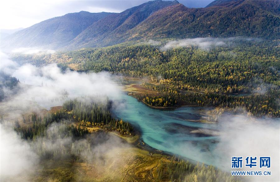 9月25日無人機(jī)拍攝的喀納斯景區(qū)風(fēng)光。新華社記者王菲攝