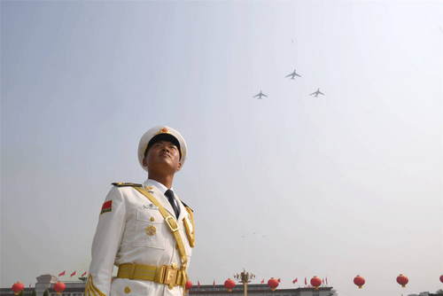 2019年10月1日,慶祝中華人民共和國(guó)成立70周年大會(huì)在北京天安門(mén)廣場(chǎng)隆重舉行。這是空中梯隊(duì)飛過(guò)天安門(mén)上空。新華社記者金良快攝