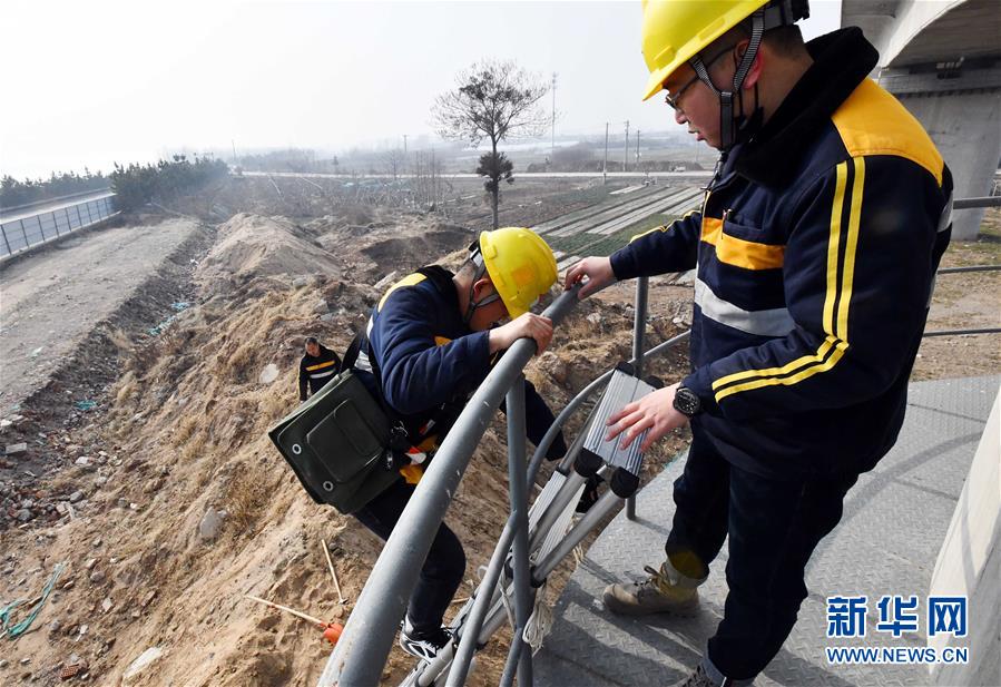 1月3日,中國鐵路濟(jì)南局臨沂工務(wù)段工程技術(shù)員準(zhǔn)備對沂河特大橋橋墩進(jìn)行檢查。新華社記者 朱崢攝