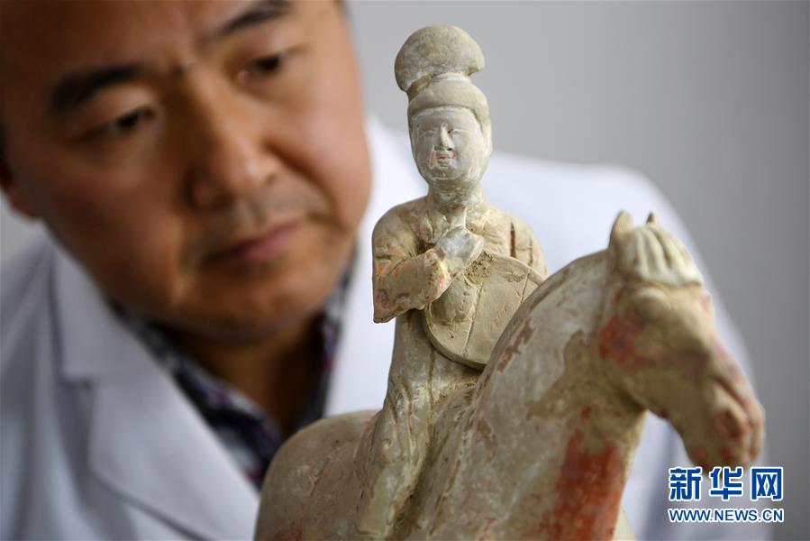 2019年12月27日,在天水市博物館文物保護修復中心陶、玉石器文物修復室,專業(yè)技術人員孟旭輝在觀察一件唐代彩繪陶俑的病害情況。 甘肅省天水市博物館文物保護修復中心有一支專業(yè)的文物修復隊伍,共有14名專業(yè)技術人員。從2012年正式成立以來,他們不僅承擔著對館藏和館外文物的修復工作,還參與了多次文化遺存的調查和搶救性發(fā)掘、古建筑彩畫保護、古墓葬搬遷復原等工作。一件件殘缺破損、滿身病害的文物經(jīng)過他們的巧手修復,又重新煥發(fā)光彩,展示在公眾面前。 新華社記者 馬寧 攝