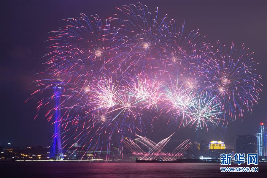2019年12月31日,澳門(mén)特區(qū)在旅游塔對(duì)開(kāi)海面綻放煙花,迎接新一年。 新華社記者 張金加 攝