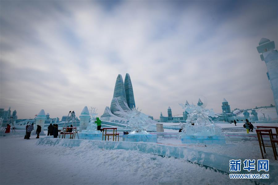 第九屆中國·哈爾濱國際組合冰雕比賽選手在哈爾濱冰雪大世界內(nèi)制作冰雕(1月2日攝)。新華社記者王松攝