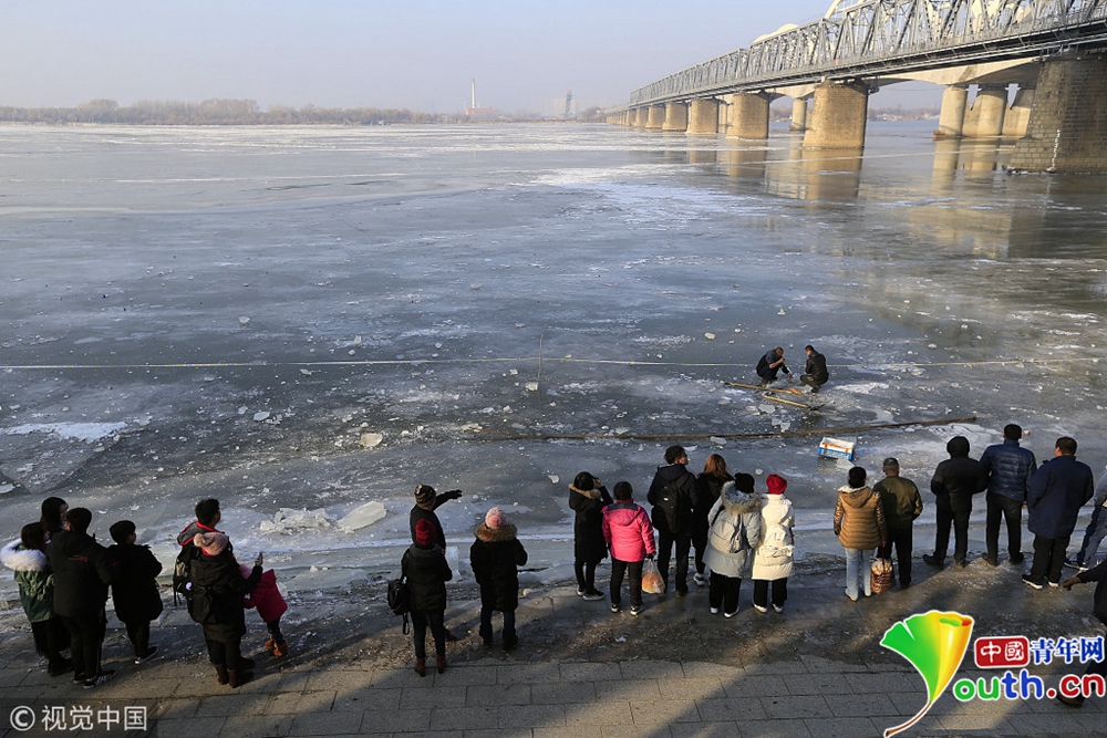 2018年11月25日,黑龍江省哈爾濱市,松花江封江不久,已經(jīng)有人蹬江鑿冰下網(wǎng)捕魚。圖片來源:視覺中國