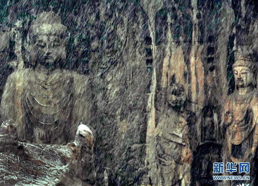 洛陽龍門石窟景區(qū)內(nèi)的盧舍那大佛在雪中若隱若現(xiàn)(1月9日攝)。新華社記者李安攝