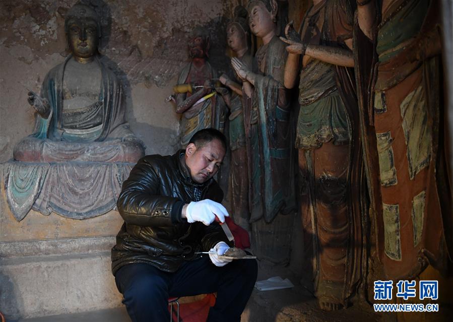 12月25日,在麥積山石窟第11窟,修復師牟常有對塑像破損處進行加固處理。