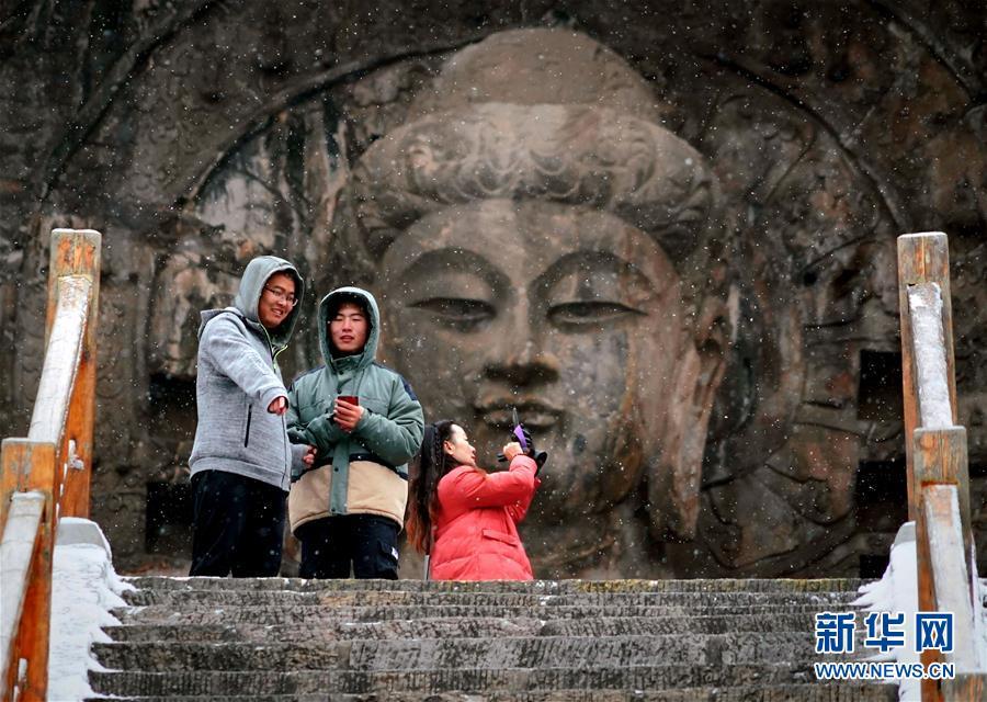 1月9日,游客在雪中游覽洛陽龍門石窟景區(qū)。新華社記者李安攝