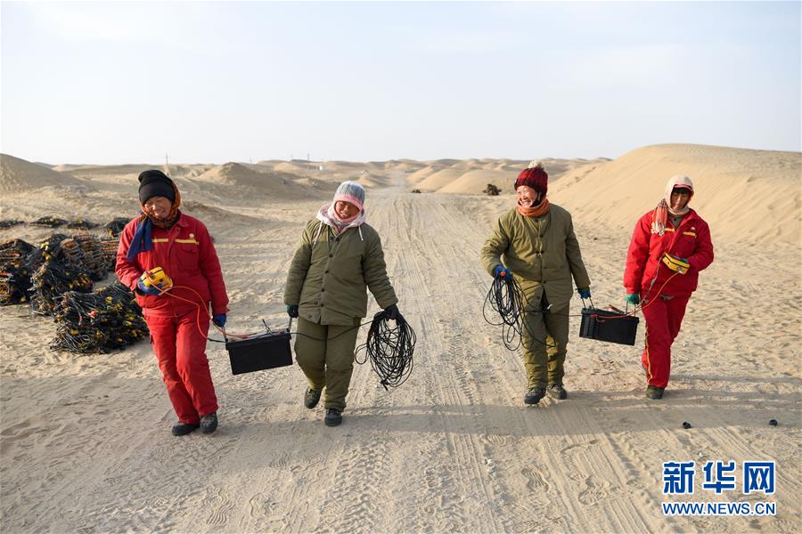 1月14日,4名測線女工抬著電瓶返回營地。地球物理勘探是油氣開發(fā)的第一步,相當(dāng)于給地球做CT。物探工人按照嚴(yán)格的測線部署,在相應(yīng)位置鉆井,然后實(shí)施地震,采集地震波數(shù)據(jù)??蒲腥藛T通過數(shù)據(jù)組成的“CT片”,就能夠清晰地“看”到地下的地質(zhì)結(jié)構(gòu),判斷哪里埋藏有石油或者天然氣。2019年10月,東方地球物理勘探有限責(zé)任公司塔里木物探處2113隊進(jìn)入新疆塔克拉瑪干沙漠腹地,開始中古14-21、塔中2兩個區(qū)塊的三維地震勘探。近2000名物探工人將在1000平方公里的范圍內(nèi)一直工作到2020年4月,這也意味著他們將在塔克拉瑪干沙漠腹地連續(xù)度過第14個除夕夜。蘊(yùn)藏著豐富石油天然氣資源的新疆塔克拉瑪干沙漠有“死亡之?!敝Q,氣候干燥,年降水量在50毫米以下,冬季地表最低溫度超過零下30攝氏度,是世界油氣勘探難度最大的地區(qū)之一。為避開風(fēng)季,物探工人每年9、10月份進(jìn)入沙漠,一直工作到來年4月,夜以繼日與黃沙、嚴(yán)寒為伴,用辛勤的汗水,為祖國找油找氣。新華社記者丁磊攝