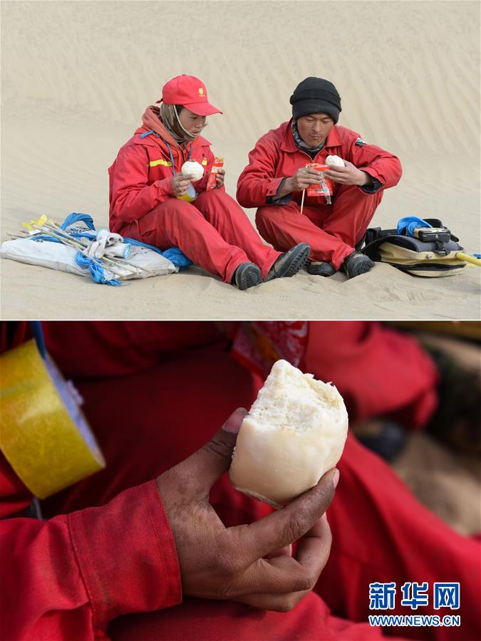 這是一張拼版圖片:上圖為測量工周國燕(左)和丈夫杞朝金在沙漠中解決午餐(1月13日攝);下圖為測量工周國燕在吃冰涼的饅頭(1月13日攝)。地球物理勘探是油氣開發(fā)的第一步,相當(dāng)于給地球做CT。物探工人按照嚴(yán)格的測線部署,在相應(yīng)位置鉆井,然后實(shí)施地震,采集地震波數(shù)據(jù)。科研人員通過數(shù)據(jù)組成的“CT片”,就能夠清晰地“看”到地下的地質(zhì)結(jié)構(gòu),判斷哪里埋藏有石油或者天然氣。2019年10月,東方地球物理勘探有限責(zé)任公司塔里木物探處2113隊進(jìn)入新疆塔克拉瑪干沙漠腹地,開始中古14-21、塔中2兩個區(qū)塊的三維地震勘探。近2000名物探工人將在1000平方公里的范圍內(nèi)一直工作到2020年4月,這也意味著他們將在塔克拉瑪干沙漠腹地連續(xù)度過第14個除夕夜。蘊(yùn)藏著豐富石油天然氣資源的新疆塔克拉瑪干沙漠有“死亡之?!敝Q,氣候干燥,年降水量在50毫米以下,冬季地表最低溫度超過零下30攝氏度,是世界油氣勘探難度最大的地區(qū)之一。為避開風(fēng)季,物探工人每年9、10月份進(jìn)入沙漠,一直工作到來年4月,夜以繼日與黃沙、嚴(yán)寒為伴,用辛勤的汗水,為祖國找油找氣。新華社記者丁磊攝