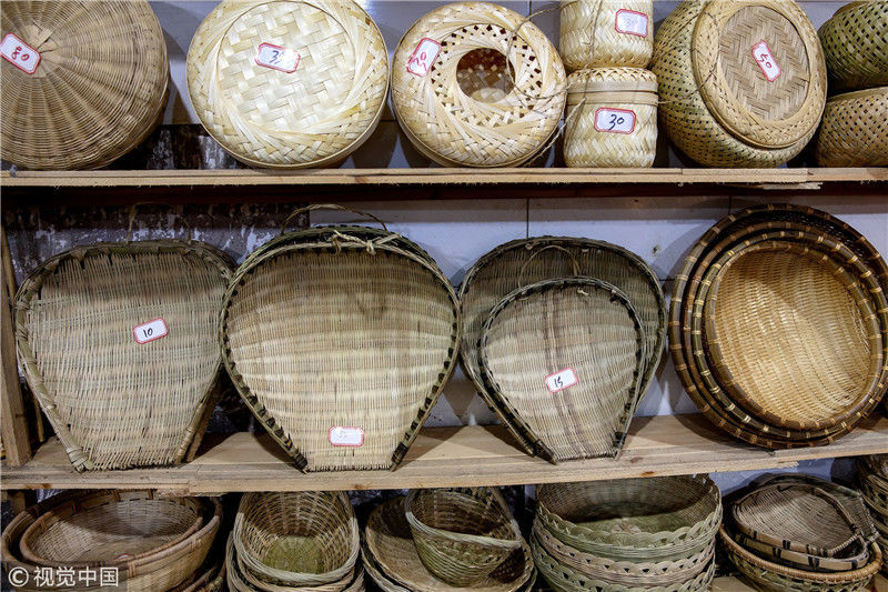 2019年1月26日,重慶中山古鎮(zhèn),880桌“千米長(zhǎng)宴”5萬(wàn)人共品年味。古鎮(zhèn)居民們編制的竹編制品。