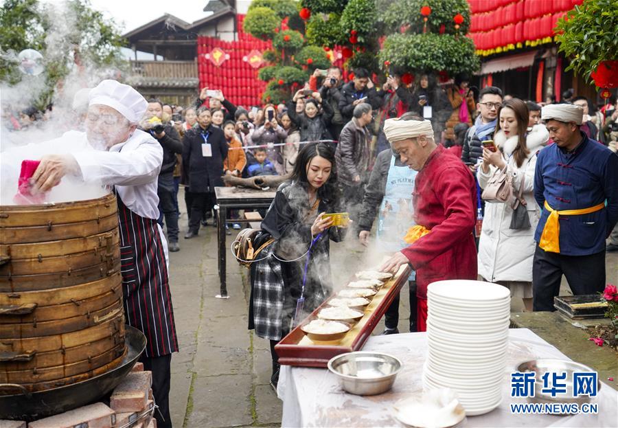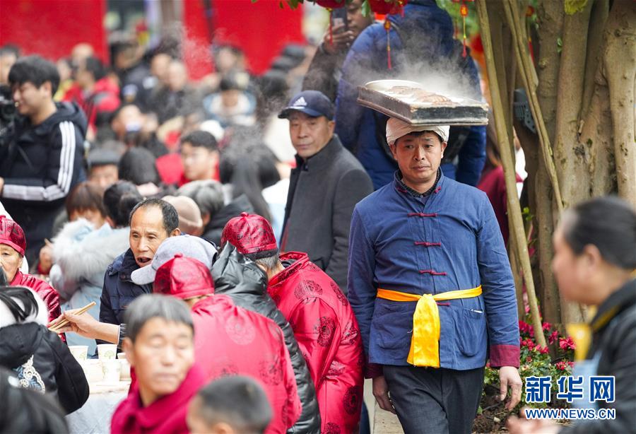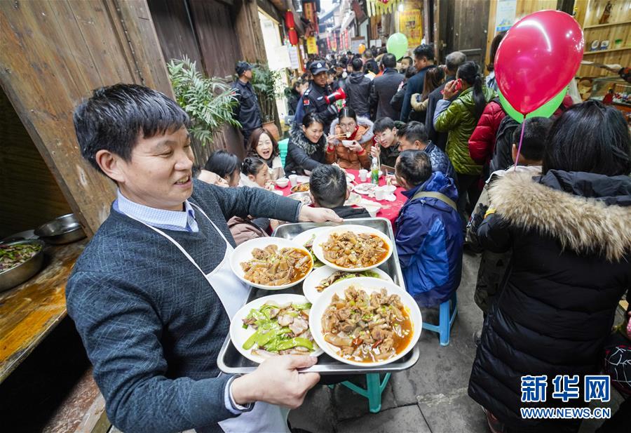 1月18日,在中山古鎮(zhèn)的“千米長(zhǎng)宴”上,民間藝人用古鎮(zhèn)傳統(tǒng)“打盆”絕藝給游客們上菜。當(dāng)日中午,伴隨著一聲“開席嘍”,一年一度的“千米長(zhǎng)宴”在重慶市江津區(qū)中山古鎮(zhèn)舉行。噴香的煙熏豆腐、軟糯的夾燒肉、可口的石板糍粑……800余桌年味十足的特色美食,吸引了兩萬(wàn)多名游客前來(lái)體驗(yàn)傳統(tǒng)民俗,感受“一雙筷子吃遍一條街”的暢快淋漓。中山古鎮(zhèn)自古就有“千米匯長(zhǎng)宴萬(wàn)人祈福祉”的習(xí)俗。每年春節(jié)期間,古鎮(zhèn)老街居民都會(huì)在千米長(zhǎng)街上大擺“百家宴”,祝福生意興隆、家業(yè)興旺、風(fēng)調(diào)雨順、五谷豐登。新華社記者劉潺攝