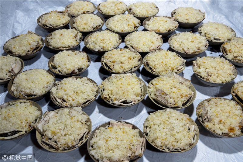 2019年1月26日,重慶中山古鎮(zhèn),880桌“千米長(zhǎng)宴”5萬(wàn)人共品年味。街坊們?cè)陬^天就開始準(zhǔn)備各種菜肴與小吃。