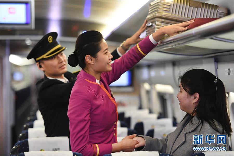 吉如(左)將盲人旅客吳瀟護送上車后,與列車長進行交接(1月15日攝)。新華社記者陶明攝