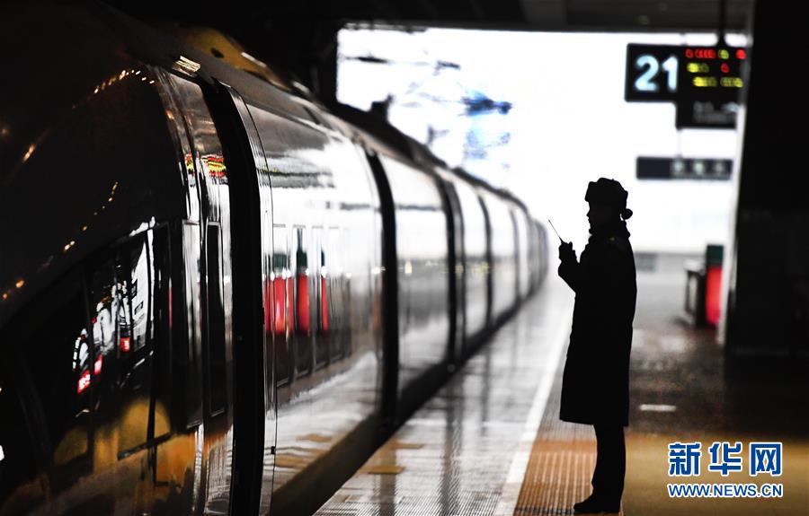 吉如在西安北站站臺上,與檢票口客運人員聯(lián)控(1月14日攝)。今年春運列車開行密度大,站臺崗位人員緊張,吉如時常被調到站臺進行站臺服務工作。新華社記者陶明攝
