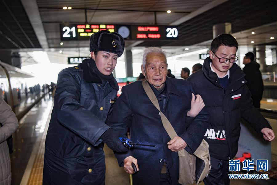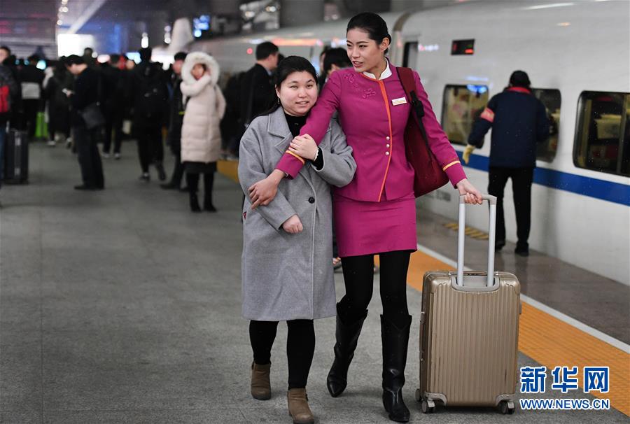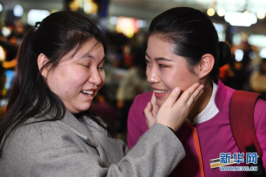 盲人姑娘吳瀟(左)從西安北站中轉回延安老家,得到吉如的溫馨服務。臨別時,吳瀟激動地說:“小姐姐,你的服務太貼心了,我看不見你,能摸摸你的臉頰嗎?”(1月15日攝)。新華社記者陶明攝
