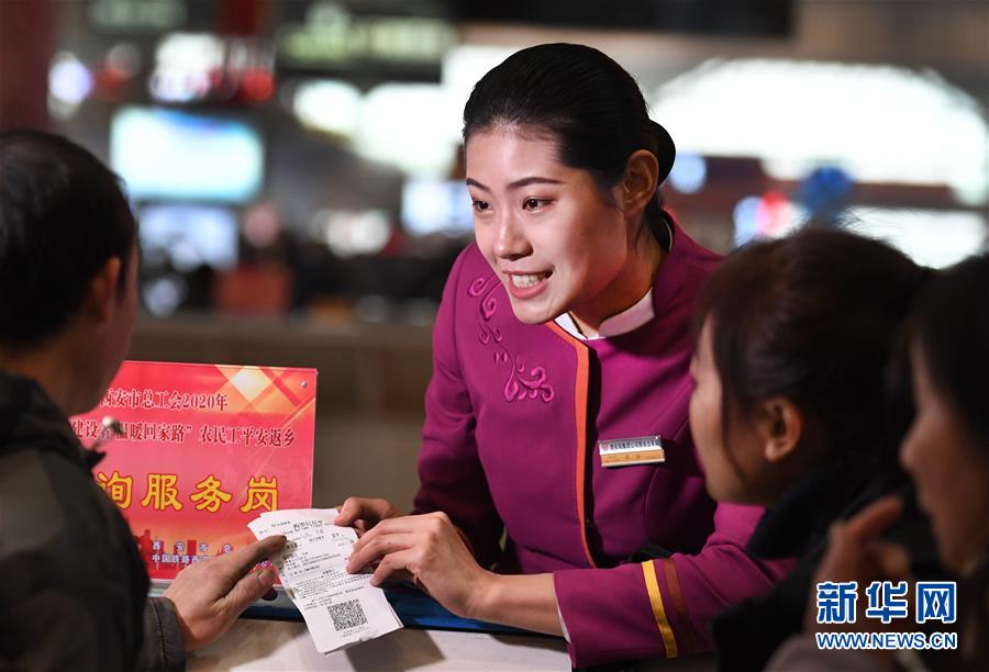 吉如在西安北站咨詢服務臺解答旅客的問題(1月15日攝)。新華社記者陶明攝