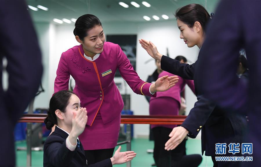 吉如(后左一)在車站職工活動室指導同事禮儀訓練(1月15日攝)。新華社記者陶明攝