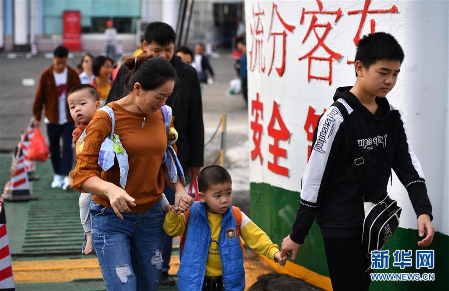 1月19日,來自湖南的務(wù)工人員在??谛阌⒏圯喍纱a頭登船返鄉(xiāng)。 新華社記者 郭程 攝