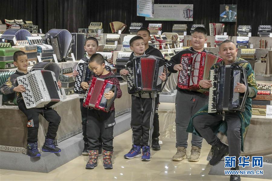 在塔城市手風(fēng)琴博物館,當?shù)匚乃噽酆谜邽橛慰脱葑嗍诛L(fēng)琴(1月21日攝)。新華社記者 趙戈 攝
