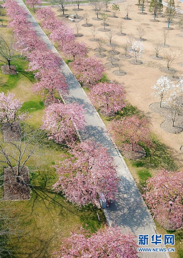 這是2月24日在上海松江辰山植物園內(nèi)拍攝的櫻花小徑(無人機(jī)照片)。 新華社記者 方喆 攝