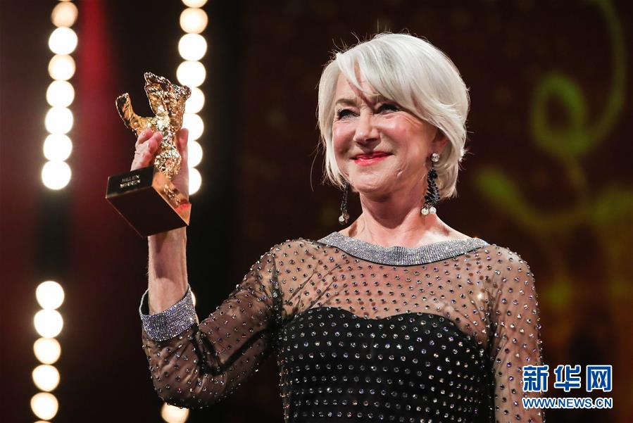 2月27日,在德國首都柏林,英國演員海倫·米倫在頒獎儀式上捧起獎杯。新華社記者單宇琦攝