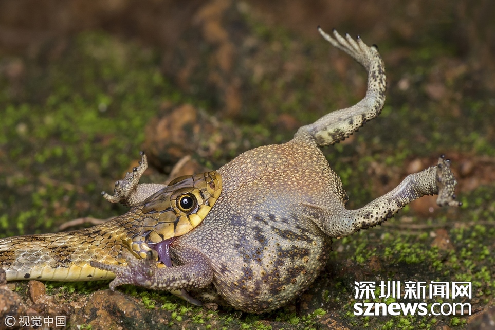 印度加爾各答B(yǎng)olpar,業(yè)余攝影師Agniswar Ghosal在Bolpar散步時(shí)拍到蛇大口吞咽蟾蜍的震撼場景。