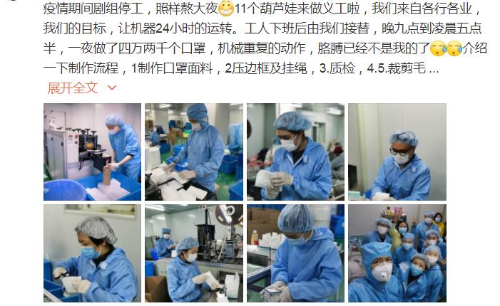 微博上,高鑫寫道:“疫情期間劇組停工,照樣熬大夜。11個(gè)葫蘆娃來做義工啦,我們的目標(biāo),讓機(jī)器24小時(shí)運(yùn)轉(zhuǎn)。工人下班后由我們接替,晚九點(diǎn)到凌晨五點(diǎn)半,一夜做了42000個(gè)口罩,機(jī)械重復(fù)的動(dòng)作,胳膊已經(jīng)不是我的了?!蔽⒉┥纤€介紹了做口罩的流程,圖文并茂,十分“走心”。