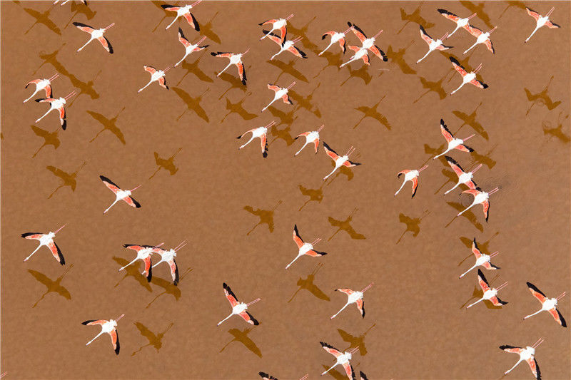 2018年1月9日訊(具體拍攝時(shí)間不詳), 西班牙卡迪茲海灣,數(shù)百只粉紅色的火烈鳥飛過五顏六色的鹽沼,在水面上形成令人驚嘆的倒影。太陽落山時(shí)分,攝影師Oscar Diez在300米高空的飛機(jī)上拍下這些令人震撼的照片。Oscar Diez/Solent News/視覺中國