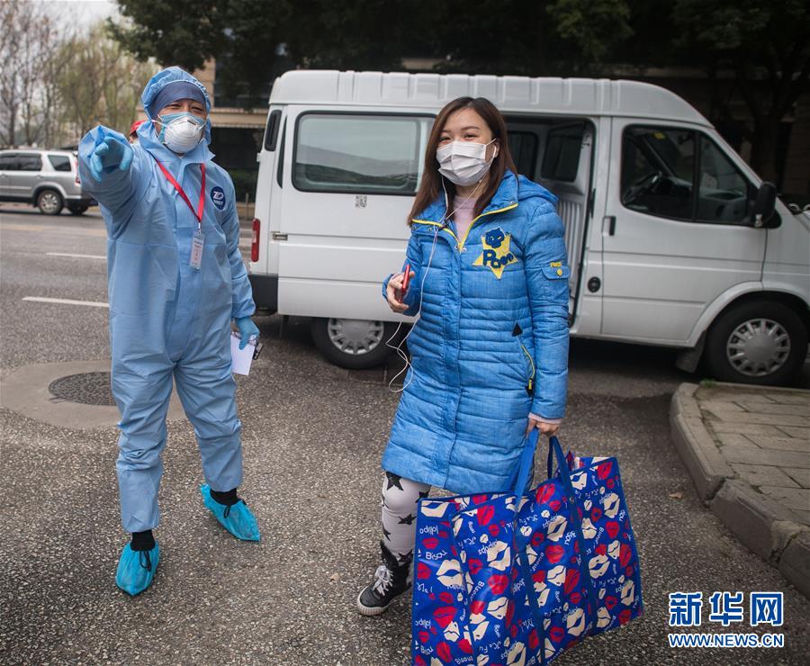 3月12日,黎婧(前)在志愿者的陪護(hù)下登上大巴。 3月12日,插畫師黎婧和84位病友離開自己居住的武漢軟件工程職業(yè)學(xué)院康復(fù)驛站,回到自己家中。他們都是治愈出院的新冠病毒肺炎患者,已經(jīng)在武漢軟件工程職業(yè)學(xué)院康復(fù)驛站進(jìn)行了14天醫(yī)學(xué)觀察,達(dá)到醫(yī)學(xué)標(biāo)準(zhǔn),成功解除隔離。他們由專車運(yùn)送至所屬社區(qū)附近的集散點(diǎn)后,在社區(qū)工作人員的陪同下回家。 新華社記者 肖藝九 攝