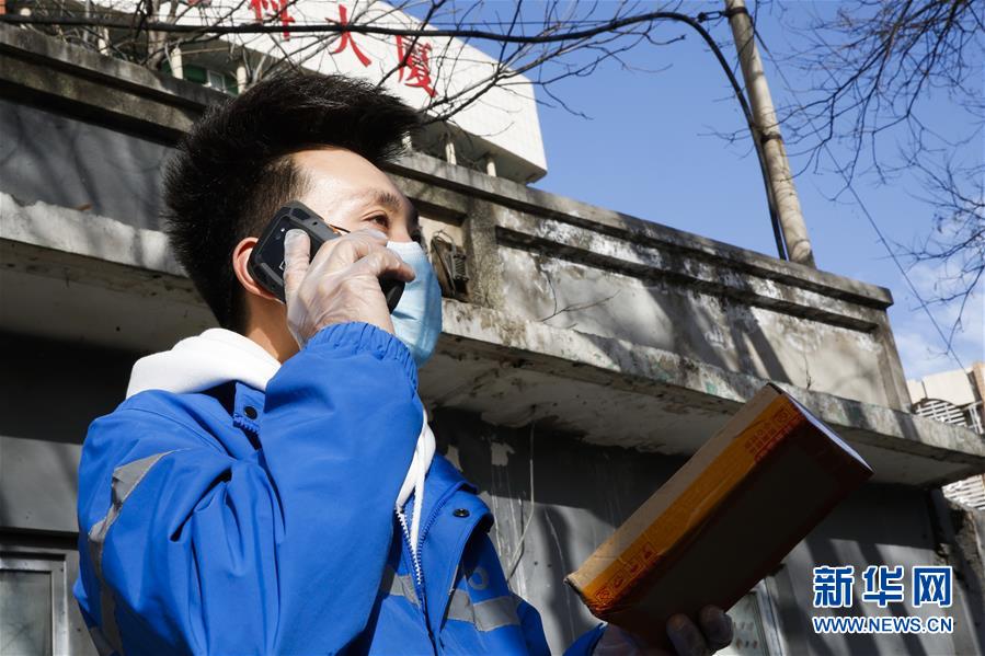 3月12日,李杰(右)在一個(gè)投遞點(diǎn)向傳達(dá)室工作人員詢問收件人的信息。新華社記者張玉薇攝