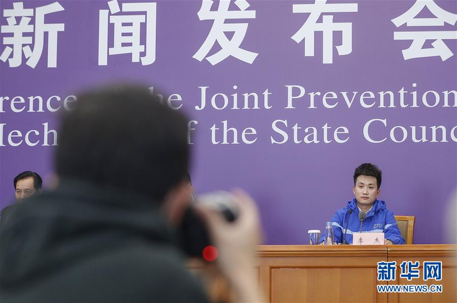 3月9日,中通快遞北京廠洼路網(wǎng)點(diǎn)快遞員李杰在北京出席國務(wù)院聯(lián)防聯(lián)控機(jī)制新聞發(fā)布會(huì)。新華社記者張玉薇攝