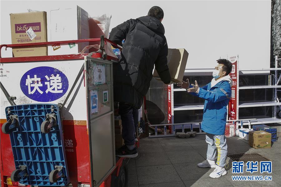 3月12日,李杰(左)在中國青年政治學(xué)院快遞點(diǎn)隔著柵欄給客戶遞送包裹。新華社記者張玉薇攝
