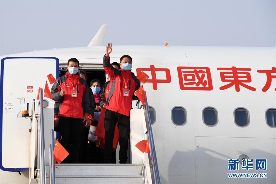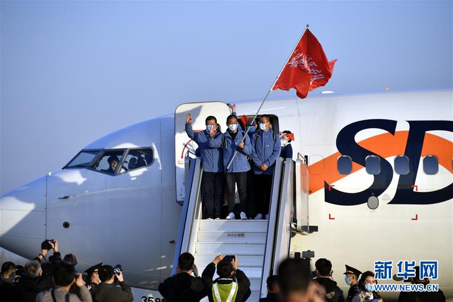 3月17日,醫(yī)療隊(duì)隊(duì)員抵達(dá)山東濟(jì)南遙墻國際機(jī)場(chǎng)。新華社發(fā)(饒琦攝)