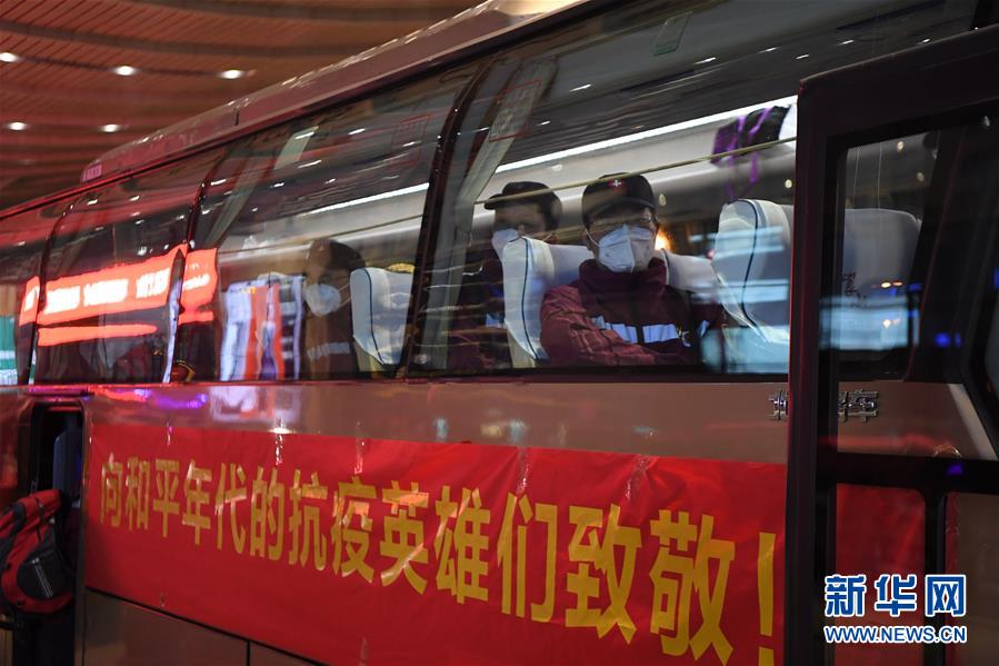 3月17日,抵達(dá)湖南長沙南站的醫(yī)療隊(duì)隊(duì)員乘坐大巴離開。新華社記者薛宇舸攝