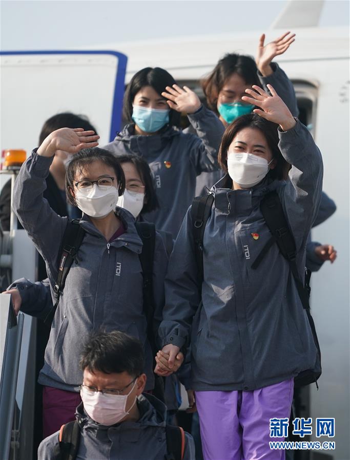 3月17日,在江蘇南京祿口國際機(jī)場(chǎng),醫(yī)療隊(duì)隊(duì)員向前來接機(jī)的人們揮手致意。新華社記者季春鵬攝