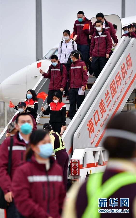 3月17日,醫(yī)療隊(duì)隊(duì)員抵達(dá)海南海口美蘭國際機(jī)場(chǎng)。新華社記者郭程攝