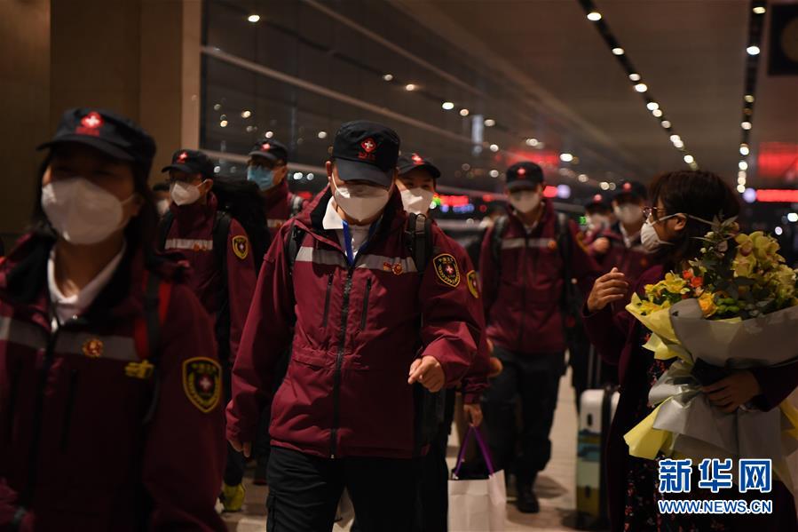 3月17日,在江蘇南京祿口國際機(jī)場(chǎng),醫(yī)療隊(duì)隊(duì)員參加歡迎儀式。新華社記者季春鵬攝