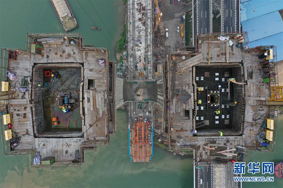 3月18日,施工人員在廣州南沙港鐵路跨西江斜拉橋東主塔進行封頂施工(無人機照片)。新華社記者劉大偉攝