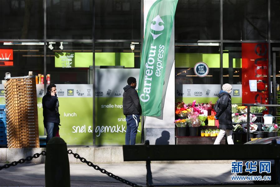 3月18日,在比利時布魯塞爾,顧客排隊等待進入超市購物。 新華社記者 張鋮 攝