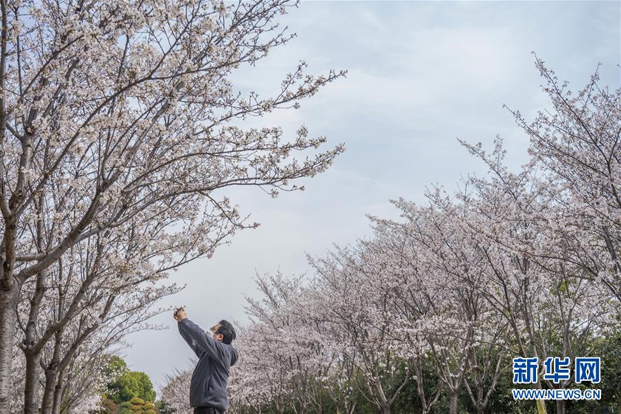 3月19日,在武漢市武昌區(qū)被網(wǎng)友稱為“武漢最美停車場”的湖北日報停車場,一名工作人員在拍攝櫻花。  新華社記者 才揚 攝