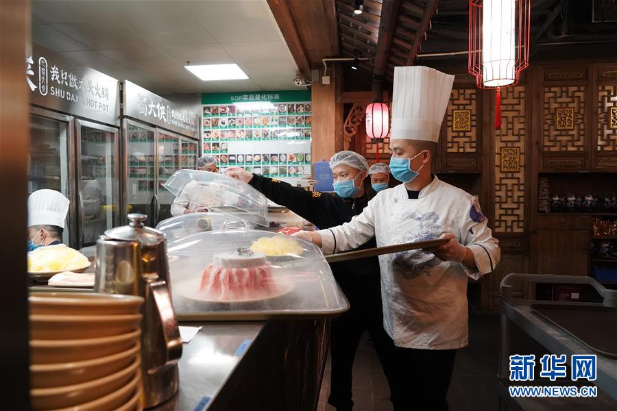 3月21日,在四川省成都市的一家火鍋店,工作人員準(zhǔn)備上菜。近日,在做好新冠肺炎疫情防控措施的基礎(chǔ)上,四川省成都市的火鍋店逐漸恢復(fù)營業(yè)。新華社記者李夢馨攝