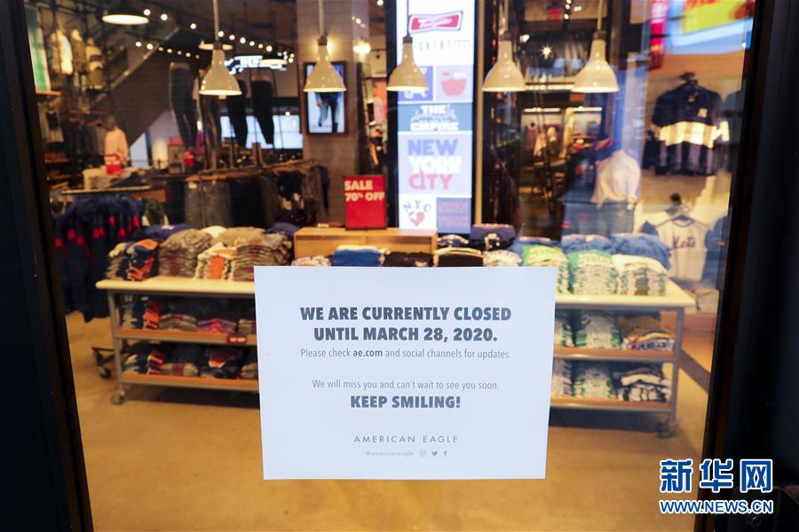 3月21日,在美國紐約時報廣場,一家服裝店貼出閉店告示。美國紐約州、伊利諾伊州、康涅狄格州20日發(fā)布針對本州居民的“居家令”,以遏制新冠病毒傳播。這些“居家令”涵蓋紐約、洛杉磯、芝加哥等大城市,影響數千萬人。白宮20日發(fā)表聲明說,總統(tǒng)特朗普已宣布紐約州出現(xiàn)“重大災難”,命令聯(lián)邦政府支援該州抗擊新冠肺炎疫情。新華社記者王迎攝
