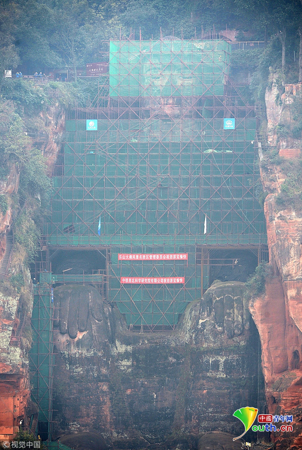 12月10日前后已逐步遮蔽大佛頭部,對(duì)頭面部進(jìn)行勘測;12月底將開始拆除頭部腳手架,保證2019年元旦節(jié)之前,先露出佛頭,供游客觀賞。