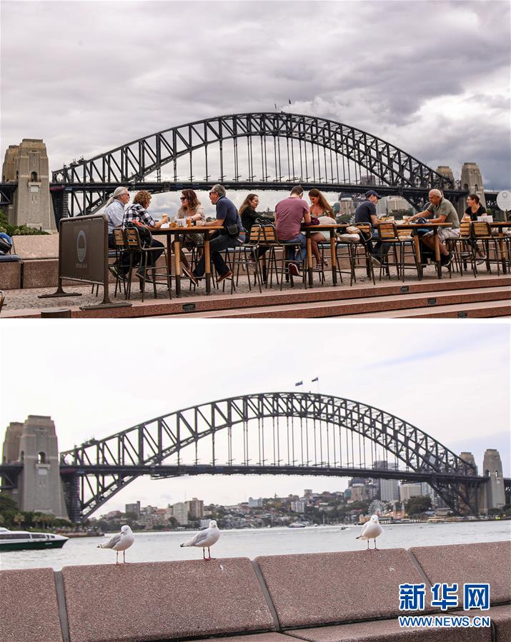 拼版照片顯示:(上)3月10日,人們在澳大利亞悉尼海港大橋附近用餐。 (下)3月24日,澳大利亞悉尼海港大橋附近空無一人。 新華社記者 白雪飛 攝