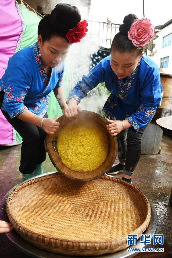 4月17日,在貴州省臺(tái)江縣姊妹街哆蝶五彩姊妹飯?bào)w驗(yàn)店,苗家婦女將蒸熟的五彩“姊妹飯”進(jìn)行攤晾。新華社記者楊文斌攝