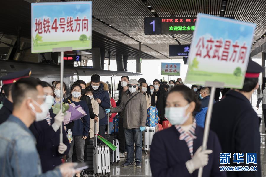 3月28日,從廣州南始發(fā)的G1112次列車到達(dá)武漢站后,旅客在志愿者的引導(dǎo)下準(zhǔn)備出站。新華社記者程敏攝
