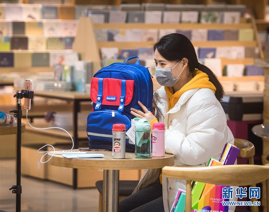 3月29日,在漢口北市場,一名主播在直播平臺(tái)直播銷售一款書包。新華社記者肖藝九攝