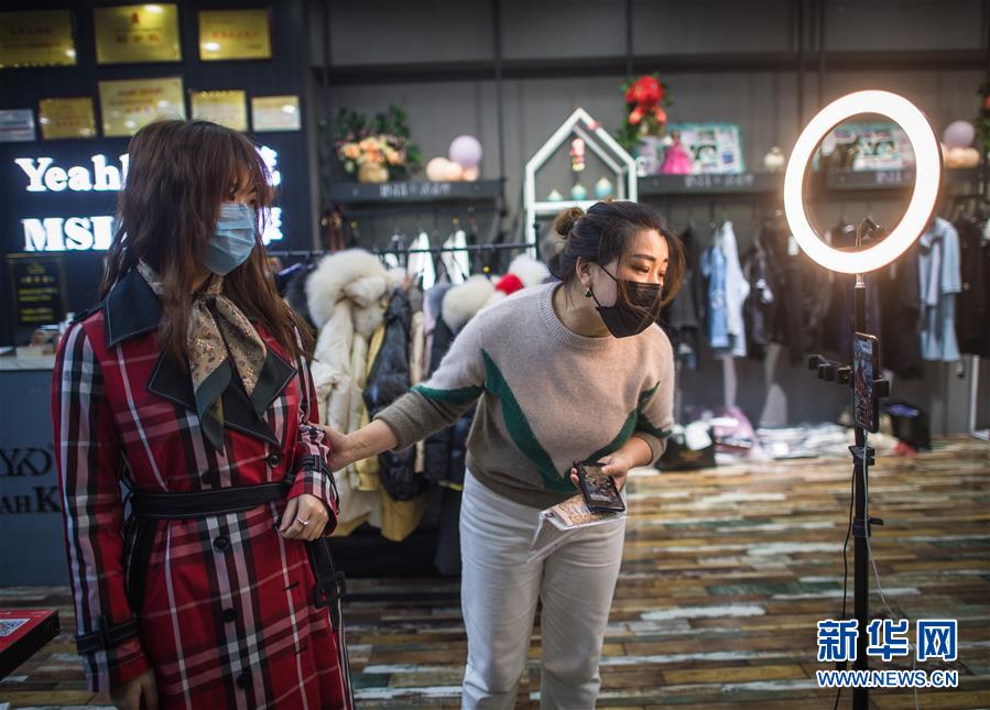 3月29日,在漢口北市場,一名主播在直播平臺(tái)直播銷售一款服裝。隨著疫情防控形勢(shì)好轉(zhuǎn),武漢漢口北國際商品交易中心30多個(gè)市場全面開市運(yùn)行。為助力商戶做好線上線下全面開市,市場積極引入50多家互聯(lián)網(wǎng)平臺(tái)、電商平臺(tái)及直播機(jī)構(gòu),服務(wù)市場商戶。新華社記者肖藝九攝